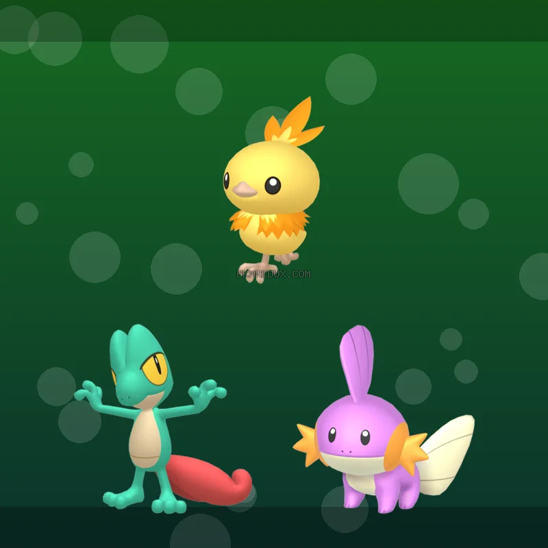 The Hoenn region starters Treecko, Torchic, and Mudkip are ready to join your team!